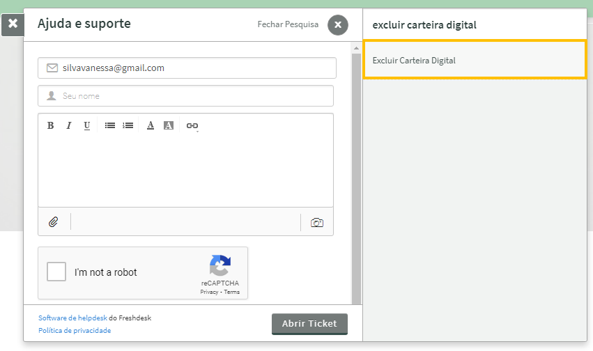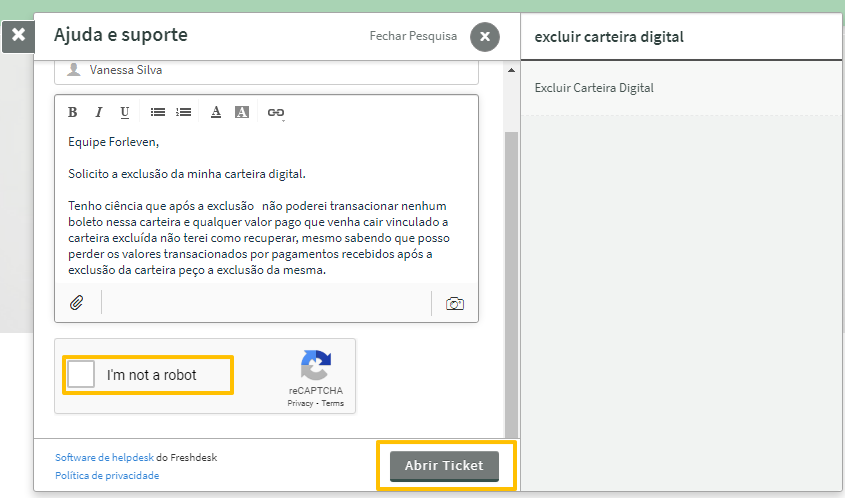 Em seguida marque que você não é um robô e clique em abrir ticket: